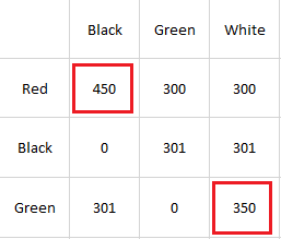 + Step 2: Eliminate pairs with nearly equal measurements. The remaining 2 pairs have different resistances: the pair with the larger resistance is the power supply pair, the pair with the smaller resistance is the signal pair. In this example, source pair: Red-Black, Signal: Green-White