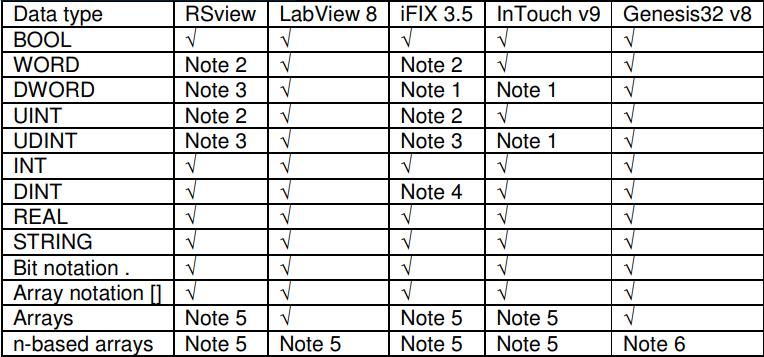 - The OPC server has been tested with a range of client software. The table below shows which data types are supported by each one
