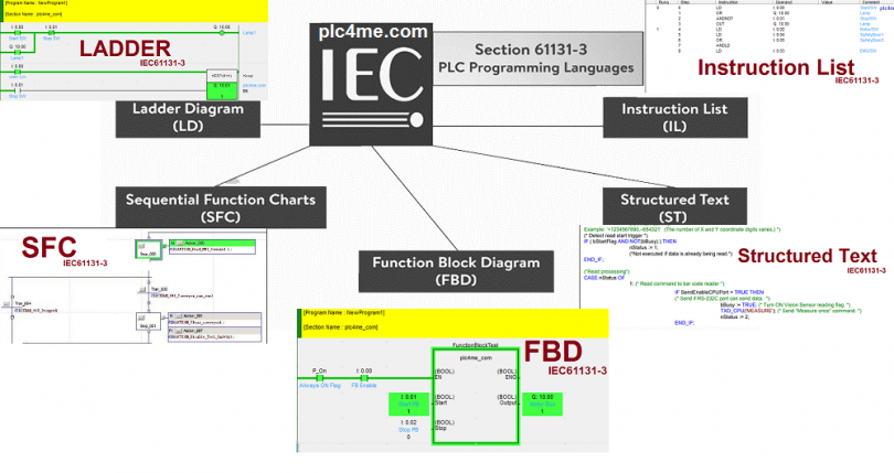 PLCs can be programmed in various ways. According to IEC 61131-3 standard, 5 programming languages are included :